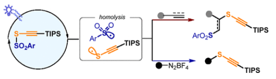 3.Radical Alkynylthiolation with Visible-Light-Sensitive S-Alkynylthio Sulfonates.Org.Lett. 2024, 26, 6966–6971.