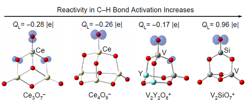 科研人员首先提出定义“氧缺陷指数”对金属氧化物团簇进行分类(Theor. Chem. Acc. 2010, 127, 449),实验结合理论发现其中一类团簇(该指数为1的团簇)以氧原子自由基为反应活性中心与甲烷(Chem. Commun. 2010, 46, 1736)等非常稳定的小分子在室温下发生化学反应;进一步发现了氧分子吸附中的单电子转移是氧自由基自发产生的重要机制(J. Phys. Chem. A ,2010, 114, 10024; 2011, 115, 10245)。通过研究二元复合氧化物团簇,发现在一系列团簇中氧自由基与主族元素铝(Chem. Eur. J. 2011, 17, 3449)、硅(J. Phys. Chem. C, 2010, 114, 12271; Chem. Eur. J. 2010, 16, 11463 / VIP article)、磷(Phys. Chem. Chem. Phys. 2010, 12, 12223)而并非与过渡金属元素钒成键,这表明V2O5/Al2O3、V2O5/SiO2等催化剂中的载体成分也可能会参与表面化学反应。通过深入分析氧自由基的反应性,发现了团簇上氧自由基局部的自旋密度分布(Phys. Chem. Chem. Phys. 2010, 12, 3984; J. Phys. Chem. C. 2011, 115, 13329)和局部的电荷分布(Chem. Eur. J. 2011, 17, 11728)可以显著影响自由基与一氧化碳、烷烃等分子反应的速率,这为调控氧自由基与稳定小分子的反应活性与选择性建立了理论基础。(yjq2012-4-29)