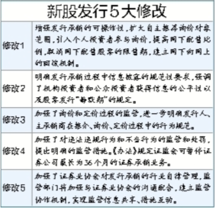 据新华社电 5月21日,证监会公布修订后的《证券发行与承销管理办法》,为新股发行体制改革的重要组成部分。办法进行了5方面修改,其中包括对IPO定价方式进行调整。专家称,此次调整对新股投机起到很大的抑制作用。