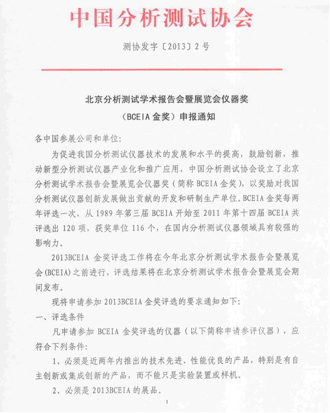 北京分析测试学术报告会暨展览会仪器奖(BCEIA金奖)申报通知