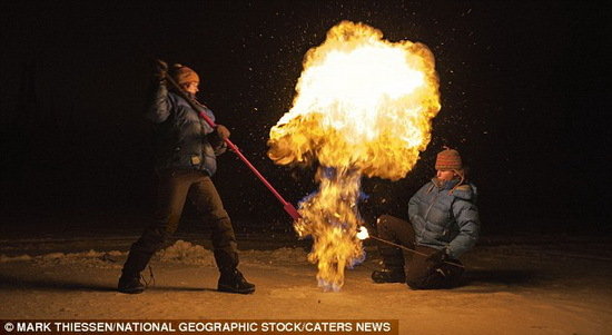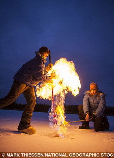 凯特伊使用一把兵工锹,刺孔冰层之下的甲烷气泡,当气体从水面洞口涌出,研究人员迅速点燃一根火柴,瞬间可形成壮观的火焰。她说:“我的工作是最糟糕的,因为通常需要点火,冰冻湖泊一个小洞每天可释放10-30升甲烷气体,能够保持全年持续释放气体。像这样的冰冻湖面小洞可凿出上百个,同时存在着大量这样的冰冻湖泊。”