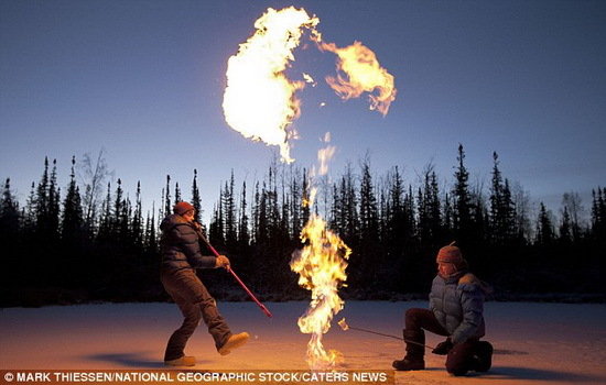 有毒可燃性甲烷气体保存在湖泊冰层以下几厘米处的手榴弹状气泡中,一旦冰下气泡释放出来,气泡中的甲烷气体将溢出,阿拉斯加大学生态学家凯特伊-沃尔特和研究同事可点燃甲烷气体形成壮观的火焰。