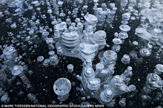 甲烷从冰层之下的泡沫中释放出来,由生态学家凯特伊-沃尔特点燃形成壮观美丽的火焰