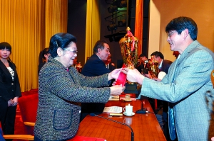 图为十届全国人大常委会副委员长顾秀莲、中国石油和化学工业联合会会长李勇武为获奖者颁奖。