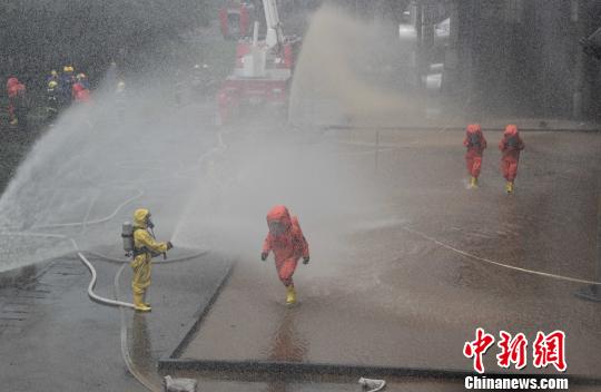图为消防演练现场,消防官兵对发生爆炸罐体进行喷水冷却。韦微摄