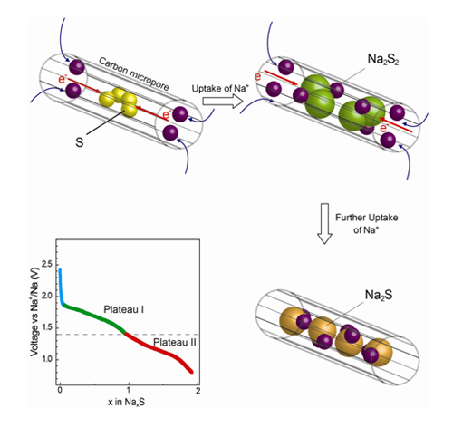 近年来,化学所分子纳米结构与纳米技术院重点实验室的研究人员对硫属元素(S、Se)的电化学性能及其在锂二次电池方面的应用进行了系统研究。前期研究中,他们提出利用碳纳米孔道限域的链状小硫分子解决锂-硫电池中多硫离子溶出难题,研制出具有长循环寿命的锂-硫电池(J. Am. Chem. Soc., 2012, 134, 18510?18513);并成功将该纳米孔道限域链状分子思想拓展到硒正极上,研制出新型高体积能量密度锂-硒电池(Angew. Chem. Int. Ed., 2013, 52, 8363?8367);并应《德国应用化学》期刊邀请撰写锂-硫电池方面综述论文(Angew. Chem. Int. Ed., 2013, 52, 13186?13200)。 最近,在国家自然科学基金委、科技部和中国科学院的支持下,化学所分子纳米结构与纳米技术院重点实验室的研究人员,在新型高比能室温钠-硫电池研究方面又取得重要进展。研究结果发表在近期Adv. Mater. (2014, 26, 1261?1265)上,并被选为当期背封面(Back Cover)论文(图1)。 钠-硫电池是以单质硫为正极,金属钠为负极,通过硫与钠间的电化学反应实现化学能和电能相互转换的一类金属二次电池。同锂-硫电池类似,钠-硫电池的正极(S)和负极(Na)也具有很高的理论比容量,使其比能量远高于目前广泛使用的锂离子电池,在智能电网等储能领域具有应用潜力。然而,传统钠-硫电池由于使用陶瓷电解质,需要在300 oC以上才能工作,存在安全隐患。此外,放电过程中,硫的还原也不完全,仅能生成Na2S3(完全还原时应生成Na2S),降低了正极材料的容量和电池的比能量。基于液态电解质的室温钠-硫电池,则受限于硫正极电化学活性低,放电中间产物易溶于电解液等缺点,存在正极活性物质利用率低、循环性能差等问题,严重影响电池的性能发挥和实际应用。 鉴于锂-硫电池与室温钠-硫电池之间的相似性,化学所的研究人员开创性地将小硫分子正极应用于钠-硫电池中,并配合钠负极和碳酸酯电解液组装出室温下即可工作的原型电池。由于该链状小硫分子室温下具有非常高的对钠电化学活性,放电过程中可完全被还原为Na2S(图2),从而使得其基于硫质量计算的正极首圈放电容量高达1610 mA h g-1,是传统高温钠-硫电池中硫正极材料的理论容量的三倍。基于电极材料计算,该室温钠-硫电池的首圈放电比能量可高达955 W h kg-1,循环200圈后仍可稳定在750 W h kg-1左右。此外,该室温钠-硫电池还具有良好的倍率和循环性能。 图1 刊载室温钠-硫电池工作期刊的当期背封面