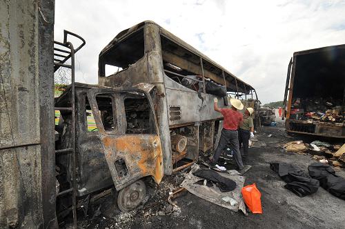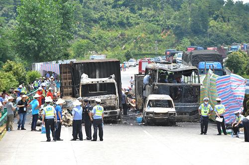 2014年07月19日凌晨2时55分许,沪昆高速湖南邵怀段发生一起特大道路交通危化品燃爆事故,一辆小货车与一辆福建开往四川宜宾的大客车追尾后燃烧爆炸,造成5车烧毁,已确认43人死亡,6人受伤。