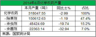 2014年6月中国除草剂总产量为150612.63吨,与13年同期相比,下调了1.19%,占当期全部化学农药产量的47.4%。杀虫剂总产量为48424.69吨,与13年同期相比下调了19.74%,占当期全部化学农药产量的15.2%。杀菌剂总产量为22363.14吨,与13年同期相比下调32.94%,占当期全部化学农药产量的7.0%。