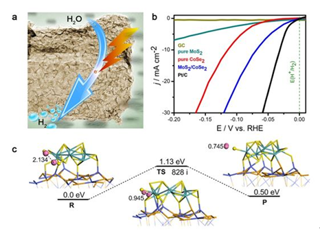 MoS2/CoSe2水还原电催化剂 (a),极化曲线 (b) 及反应机理 (c)