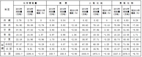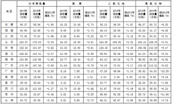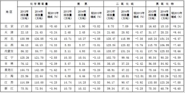 公告指出,2014年,全国化学需氧量排放总量2294.6万吨,同比下降2.47%;氨氮排放总量238.5万吨,同比下降2.9%;二氧化硫排放总量1974.4万吨,同比下降3.4%;氮氧化物排放总量2078万吨,同比下降6.7%,四项污染物排放量较2010年分别下降10.1%、9.8%、12.9%和8.6%,其中化学需氧量和二氧化硫已提前完成“十二五”任务,氨氮接近完成,氮氧化物减排超过序时进度。