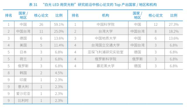 该热点前沿的 44 篇核心论文无论从研究内容还是从数量分布都体现了上述行业发展趋势。该热点前沿 12 个国家参与了核心论文的产出。中国以 59.1%的比例,占据第 1 名,是第 2 名中国台湾的 2.4 倍(表31)。德国和美国分别位列第 3 和第 4 名。核心论文机构列表中,中国科学院遥遥领先,其次是台湾大学和中国地质大学。