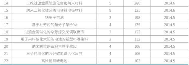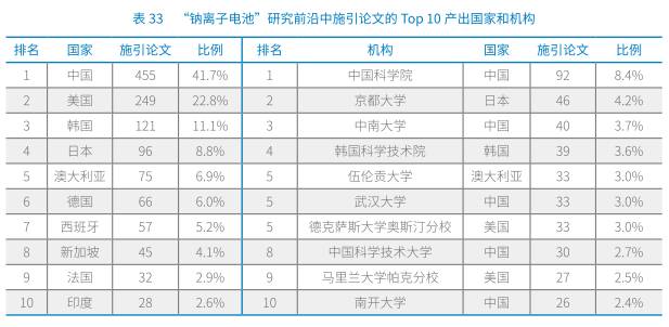 统计结果显示(含新兴前沿中的“钠离子电池”),无论是施引论文还是核心论文,该领域的研究主要出自中国、美国、韩国和日本等国家。排名前列的机构包括中国科学院、日本的京都大学、中国的中南大学和韩国科学技术院。中国在该领域的主要研究机构有中国科学院、中南大学、南开大学等。中国科学院物理研究所胡勇胜教授的研究成果是核心论文之一。