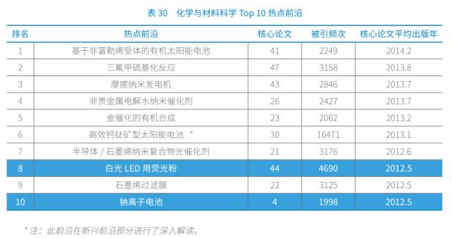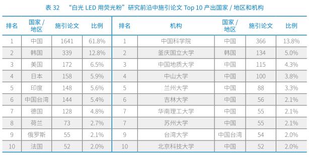 中国于 2011 年发布《国家“十二五”科学和技术发展规划》,提出重点发展白光 LED 制备等自主关键技术。中国的核心论文和施引论文基本都发表在“十二五”时期,不仅在数量上领先,中国学者的研究影响力也很高。中国科学院长春应用化学研究所在化学领域顶级刊物 Chemical Society Reviews 上发表综述文章。华南理工大学的综述文章被引超过 500 次,在核心论文中被引频次最高。