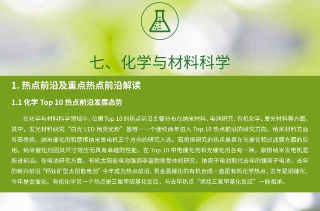化学与材料科学领域有 22 项研究入选新兴前沿,主要分布在钙钛矿型材料、电池研究、有机化学、纳米材料等方面。在钙钛矿型材料方面,有 5 项研究入选,除了用于太阳能电池外,该材料还被发现在发光材料和光电探测器方面具有应用潜力。在电池研究方面,除了钙钛矿型太阳能电池外,锂氧电池、锂硫电池、钠离子电池、聚合物太阳能电池和染料敏化太阳能电池也是重要研究方向。在有机化学方面,不对称催化和过渡金属催化一直是前沿的研究方向,金属有机框架化合物和柱芳烃的研究也有入选。在纳米材料方面,无论是零维的碳量子点,二维的二氧化锰、过渡金属硫族化合物,还是三维的核壳结构,入选研究均侧重于纳米材料在光、电方面的性能和应用研究。“纳米颗粒的细胞生物学效应”进入前沿,反映了随着纳米材料的迅速发展,其安全性越发引起关注。