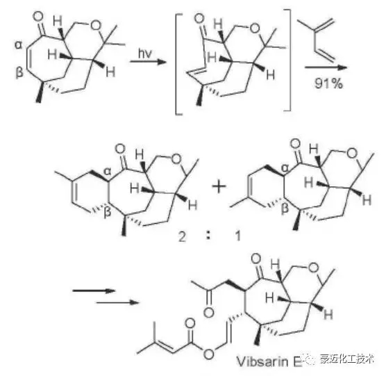 引言 光化学反应对人类的生存和发展起着不可或缺的作用。从光合作用合成人类基本生存所需的氮气、食品和衣物到社会高度发展所需的各种新型材料、保健药品以及维护生态环境的光化学废物处理, 人类生活的很多方面都与光化学反应相关。有光参与的化学反应避免了许多传统化学反应给环境带来的污染(如有毒溶剂和废水)。此外, 通过光化学处理各种有机废物, 还可以消除对环境的影响。 1 有机光化学原理 光化学反应是指物质的分子吸收了外来光子的能量后激发的化学反应。 光是一种电磁波,具有波粒双重性质。光的最小单元是光子,对于1 mol 光子,所吸收的能量E为: E=Nhc/λ (1-1) N为Avogadro常数(6.023×1023mol-1),h为Plank常数(6.62×10-34j·s),C为光速(2.998×108m/s),λ为光的波长。 光对反应物分子辐射时,分子中的电子将从一个电子轨道跃迁到另一个较高能级的电子轨道即由基态分子M变成激发态分子M*,之后才有可能进行化学反应。参与光化学反应的分子轨道有5类,即:n、π、π*、σ和σ*轨道。 光化学反应中涉及的电子跃迁方式主要有以下3种: (1) π → π*跃迁:烯烃中的π键吸收光后,π轨道中的一个电子跃迁到π*轨道上,即是π→π*跃迁。 (2) n→π*跃迁:由于分子中参与形成双键的杂原子(如O,N,S)具有孤对电子,光激发后杂原子上的孤电子将从非键轨道(n-轨道)跃迁到反键π*轨道,即发生n→π*跃迁。 (3) n→σ*跃迁:一些与碳以单键连接的杂原子化合物,如醇、硫醇、胺、卤化烃等,在波长小于200 nm光作用下,可发生n→σ*。 2 各种类型有机光化学反应 2.1 光照重排反应 Z/E异构化反应:烯烃在直接光照下或在加入敏化剂下光照可以发生异构化反应。Yoshihisa. Inoue等[1]报道了在光敏剂的作用下环辛烯发生了顺反异构反应,如图1所示: 图1 环辛烯的顺反异构变化 光诱导δ迁移重排反应:根据Woodward-Hoffman,分子在发生重排时,起决定作用的分子轨道是共轭烯烃的HOMO。为了使共轭多烯两端的碳原子的p轨道旋转关环生成δ键时,经过一个能量最低的过渡态,这两个轨道必须发生相同的重叠。如图2所示的共轭体系的δ迁移重排反应: 图2 共轭体系的δ迁移重排 双-(π-甲烷)重排反应:这类反应可以控制产物的立体构型,所以广泛应用于有机合成中[2]。如图3所示: 图3 双-(π-甲烷)重排反应 2.2 光环化反应 [2+2]环加成:两个独立的π电子体系在光照作用下合成一个环丁烷结构,环丁烷进一步可发生断键、扩环或缩环反应。反应在分子间与分子内都能发生;共轭双键、非共轭双链、羰基与其它杂原子的π体系上都能进行这种反应。 最早Angelo. Albini和Maurizio. Fagnoni便发现了香芹酮在光照下转变成了香芹樟脑[3],如图4所示: 图4 香芹酮的光照转变反应 Ian K. Mangion等人[4]利用[2+2]环加成这一关键步骤合成了天然产物Littoralisone,如图5所示: 图5 Littoralisone的光化学合成 IriondomAlberti等人报道了烯烃于醛加成醚环结构反应,这为杂环化合物合成提供了新方法[5],如图6所示天然产物Merrilactone A的合成就利用这一反应作为关键步骤: 图6 氧杂环的光化学合成 [4+2]环加成反应:在光照的条件下反应,与传统意义的反应相比具有不同的空间立体选择性,所以可以根据产物的空间立体构型选择合适的合成方法。如图7所示,Davies. H. M等人合成了具有特定空间立体构型的天然产物[6]: 图7 Vibsarin的光化学合成 杂环双键[4+4]光环合加成反应:此类型反应生成交叉环合物对于复杂多环结构化合物的合成具有特殊的意义。Yeon-Hee Lim等人报道了此类型的反应,如图8所示,他们利用2-吡啶酮类化合物通过[4+4]光环合加成反应一步合成一个杂环化合物[7]。 图8 2-吡啶酮的[4+4]光化学合成 3 光化学反应在微反应器中的应用 Mizuno等[8]将萘的衍生物进行光催化环加成反应,提高了反应的效率和区位选择性。当物料流速为0.5 μL/min,照射时间为3.4 min时,环加成产物的产率分别为59%和9%;而在分批操作时,产率虽可分别达56%和17%,但反应时间要长达3 h。 Ueno 等[9]在微反应器中研究了芘的光氰化反应,使用三层反流(水-油-水)式反应可使转化率达73.0%。 在微反应器中进行的2,4-二异氰基甲苯的光化学氯化反应[10],当温度130 ℃,停留时间为9 s时,产率可达到81%,反应器的时空转换率可高达401.0 mol/(L·h);而在常规反应器中则仅为1.3 mol/( L·h)。