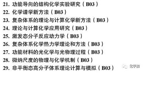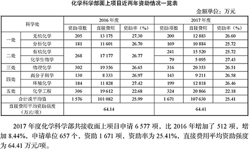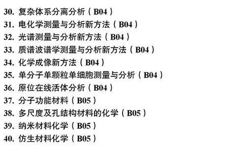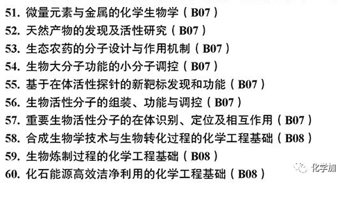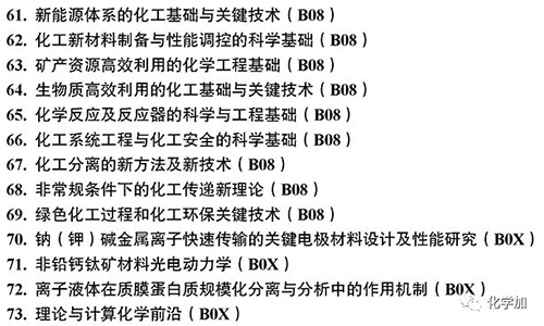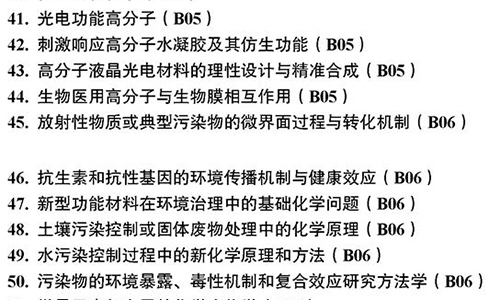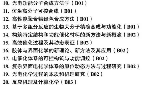 化学科学部新的项目资助方向为:1)合成化学;2)催化与表界面化学;3)化学理论与机制;4)化学测量学;5)材料化学与能源化学;6)环境化学;7)化学生物学;8)化学工程与工业化学。