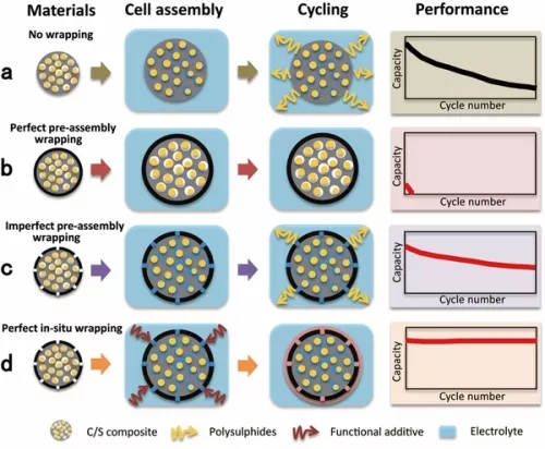 在此新工作中,研究人员预先在碳/硫复合颗粒上生长一层不完美的含孔的预包覆层(在材料制备过程中完成),后将由此材料制备而成的正极与含有特殊添加剂的电解液一起组装成电池。在电解液浸润碳/硫颗粒的同时,添加剂将与预包覆层发生反应,从而在颗粒外部原位形成致密的包覆层。