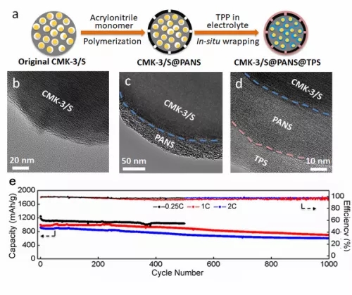 图2.(a)原位包裹流程图。(b)无包裹的碳/硫材料,(c)包裹层有缺陷的碳/硫材料和(d)原位包裹的碳/硫材料的透射电镜图片。(e)原位包裹的原位包裹的碳/硫材料的长循环性能图。