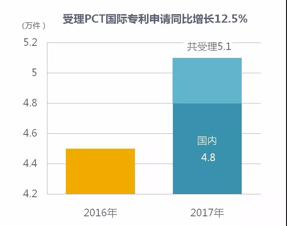 2017年,国家知识产权局共受理PCT国际专利申请5.1万件,同比增长12.5%。其中,4.8万件来自国内,同比增长12.5%。