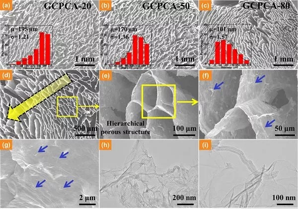 (d-f)GCPCA-80定向排列的分级多孔结构在不同放大倍数下的SEM图像