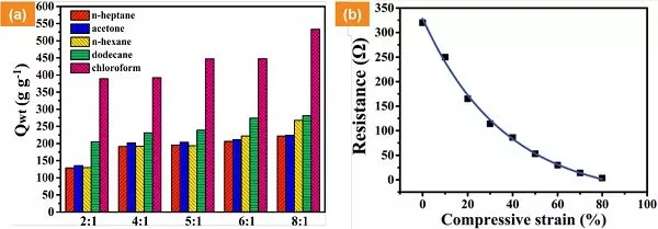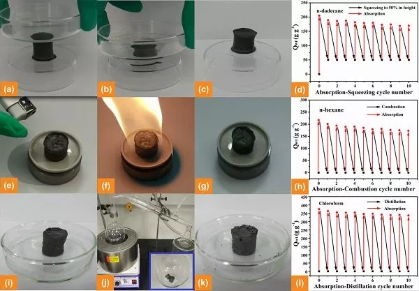 石墨烯复合气凝胶的多级孔结构,在保证优异的机械强度的前提下,改善了气凝胶孔道内的毛细管作用,从而进一步提高吸附速率,其对有机溶剂三氯甲烷的吸附量高达气凝胶自身质量的501倍,远远高于大多数报道的吸附材料。此外,所制备复合气凝胶可根据不同有机溶剂的特性,选择不同的回收方式,复合气凝胶在吸附-挤压、吸附-燃烧和吸附-蒸馏循环中表现出优异的可重复利用性能,经过10次吸附-解吸附循环后可保持近90%的初始吸附容量。此外,该复合气凝胶还可展示出与其压缩形变密切相关的特殊电性能。