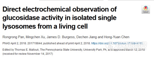 近日,南京大学化学化工学院陈洪渊院士团队在单细胞分子动态分析系统研究中再次取得重要进展。相关成果Direct Electrochemical Observation of Glucosidase Activity in Isolated Single Lysosomes from a Living Cell发表在国际一流期刊 《美国科学院院刊》(Proceedings of the National Academy of Sciences, PNAS)。文章链接为http://www.pnas.org/content/early/2018/03/28/1719844115。