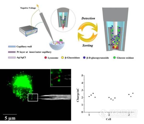 在此基础上,项目组进一步提升单细胞电化学分析的空间识别能力至纳米级,建立了可分析单个细胞器(直径 ~100 nm)中蛋白化学活性的“试剂盒”。该装置利用电输运,将胞内单个溶酶体颗粒分离进入毛细管尖端;基于溶酶体在纳米针尖限域空间的受限扩散,循环转化被检蛋白(葡萄糖苷酶)的底物,产生足量的过氧化氢加以电化学定量测定。这是首次实现活细胞内单个细胞器中蛋白活性的电化学测量,对于阐明细胞器功能的分子基础以及提升电化学分析空间分辨能力均具有重要价值。处于毛细管针尖的试剂盒成分可通过可控电输运加以更新,实现胞内多个溶酶体颗粒的比较研究,成功揭示了胞内溶酶体中葡萄糖苷酶活性具有均质性的特征,为进一步理解细胞个体差异性的生物学起源提供了一套全新的生物学数据。