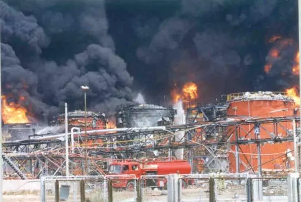 这起爆炸火灾发生后,瞬间整个储罐区上空火光冲天,火焰高达上百米,6万多平方米罐区一片火海,公安消防队到场后6个1万立方米油罐,2个2千立方米,2个1千立方米的油罐和5个1千立方米的球罐,两列油槽罐车同时都在猛烈地燃烧,强烈的辐射热将火场东西长3千米、南北宽1千5百米周围内的。树木都烤焦,油罐火,装置火,管道火同时燃烧,猛烈火势持续时间长达20多小时,火势十分凶猛形成大面积立体火灾。