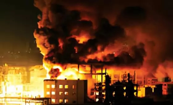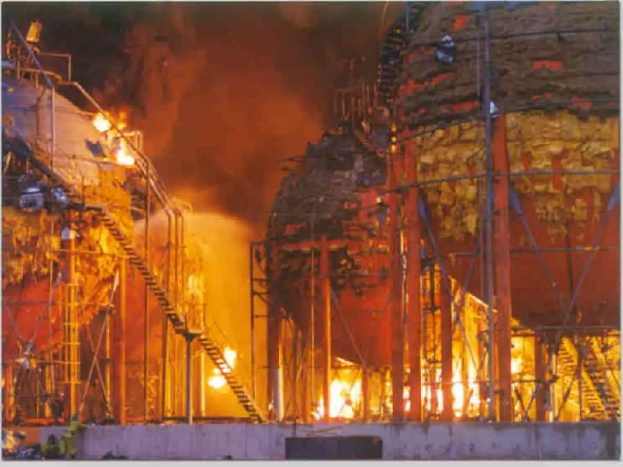 操作室天花板、门窗和表盘炸塌炸损。罐区周边的房屋及建筑物部分被摧毁,强烈的辐射热将罐区四五平方公里内的树木全部烤焦。