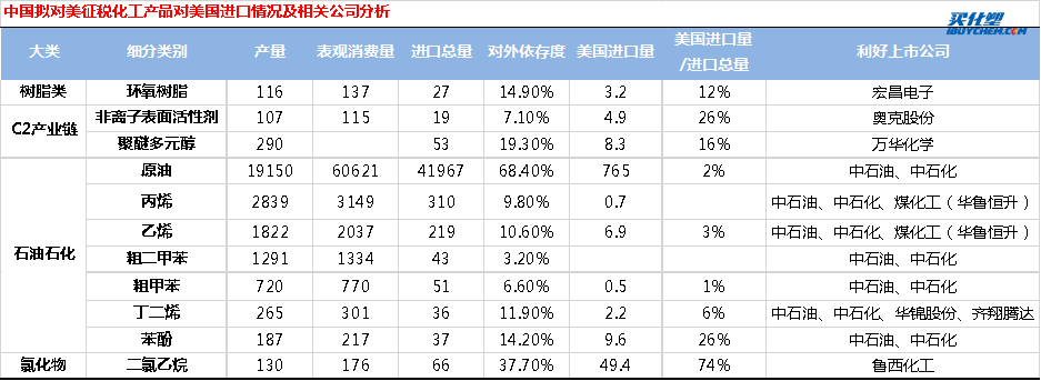 买化塑研究院认为,中国征收关税,直接利好相关进口替代产品(详情下表):