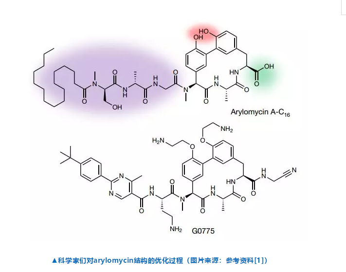 随后,研究人员们又对这个分子的C端,以及大环上的苯酚基团进行了修饰,进一步提高其抗菌活性。最终,一款名为G0775的分子诞生了。与原始的arylomycin相比,它针对多重耐药菌的活性要高500倍,有望治疗难治的革兰氏阴性菌感染。有趣的是,尽管革兰氏阳性菌不是最初研发的目标,但这款新分子也能对其进行有效的杀伤。