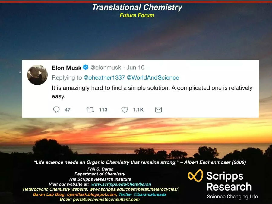 作为一名有机化学家,我最喜欢的一句话来自一个我最喜欢的人,这个人就是Elon Musk。几个月前,他的一条推文高度概括了我们实验室在过去15年中所做的工作,也基本上总结了目前有机化学领域的现状:为真正困难的问题提出过度设计和复杂的解决方案很容易。而相比之下,针对同样的问题提出极其简单的解决方案是极度困难的。