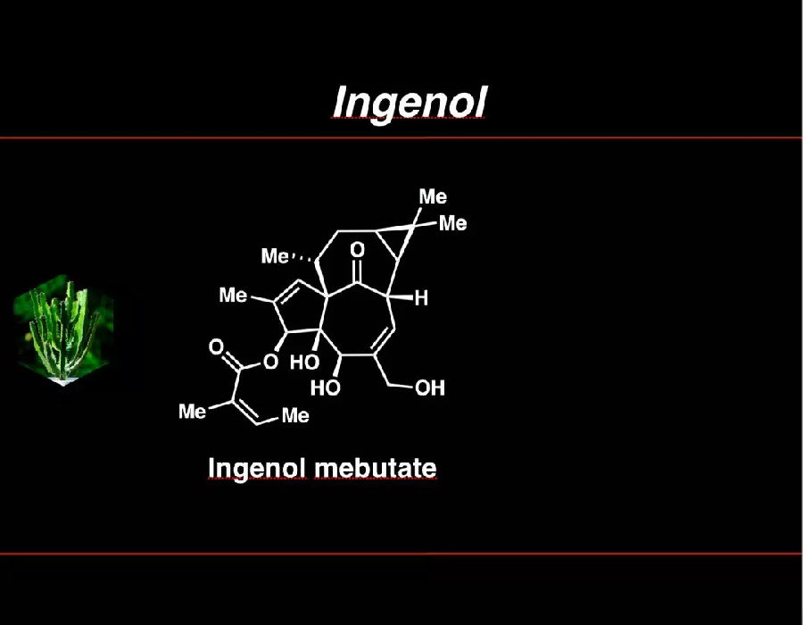 第一个是Ingenol,它是一种从野草中提取的自然物质,是一种萜烯(tiēxī)。Ingenol目前已经在全球范围内应用于治疗光化性角化病,一种癌前的皮肤病变。