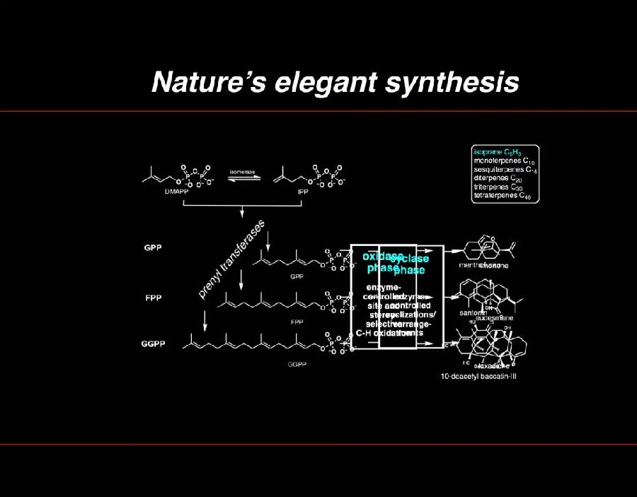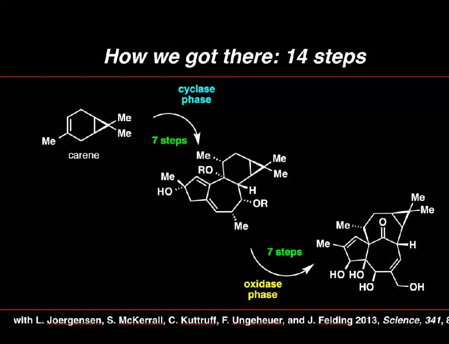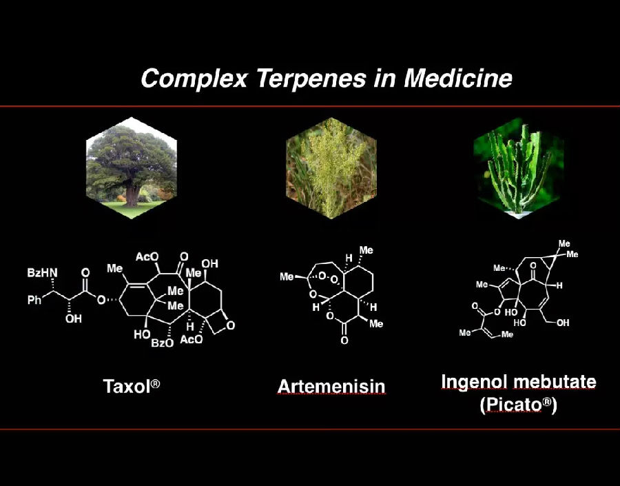 萜烯中最复杂的例子之一是紫杉醇(taxol),一种价值十亿美元的药物。这种化合物被广泛应用于乳腺癌治疗。紫杉醇是一种非常有用的天然产品,并且非常复杂。还有青蒿素(Artemenisin),它在中国很有名,是被用作治疗疟疾的最后手段。发现这一宝贵天然产物的中国科学家屠呦呦也因此被授予诺贝尔奖。还有就是上面说到的Ingenol mebutate(巨大戟醇甲基丁烯酸酯),一种很有趣的天然产物,我们特别喜欢它,因为它具有精简合成方法的潜力。
