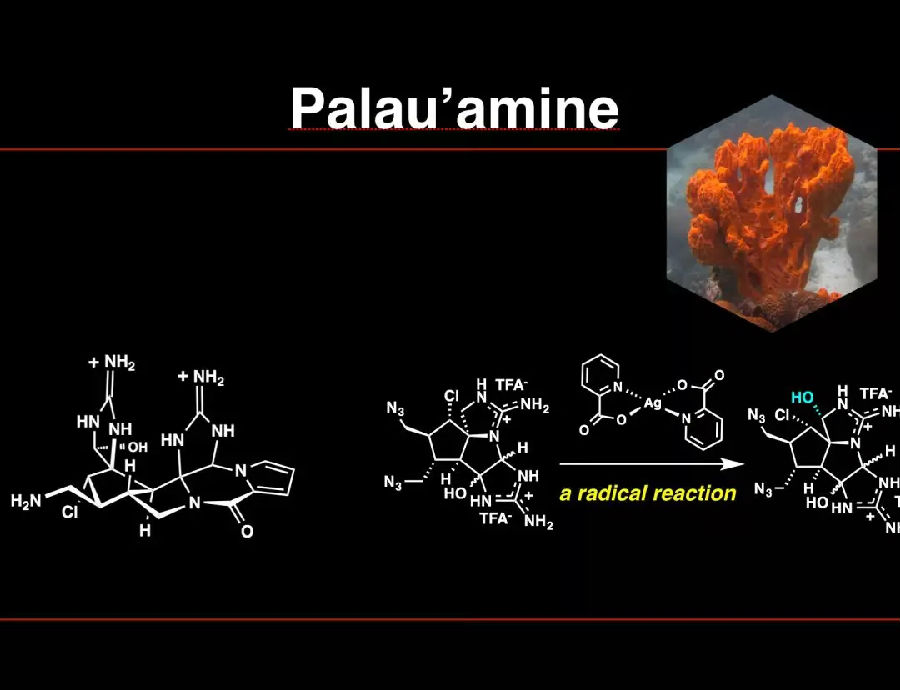 第二个例子,是一种名叫Palau'amine的橙色天然海绵。我和我的团队花了10年时间才把它组合在一起。下面我来重点说一下其中一个关键反应——氧化反应。你会注意到的是,在这个反应中发生的是在一个特定位置加入一个蓝色氧原子并完全控制氧化态。这样做了之后,我们意识到这种反应具有特定的化学选择性。事实上,它实际上是一种自由基反应。由于这个发现,我们开始思考其他自由基反应可能在药物背景下更广泛地产生影响。