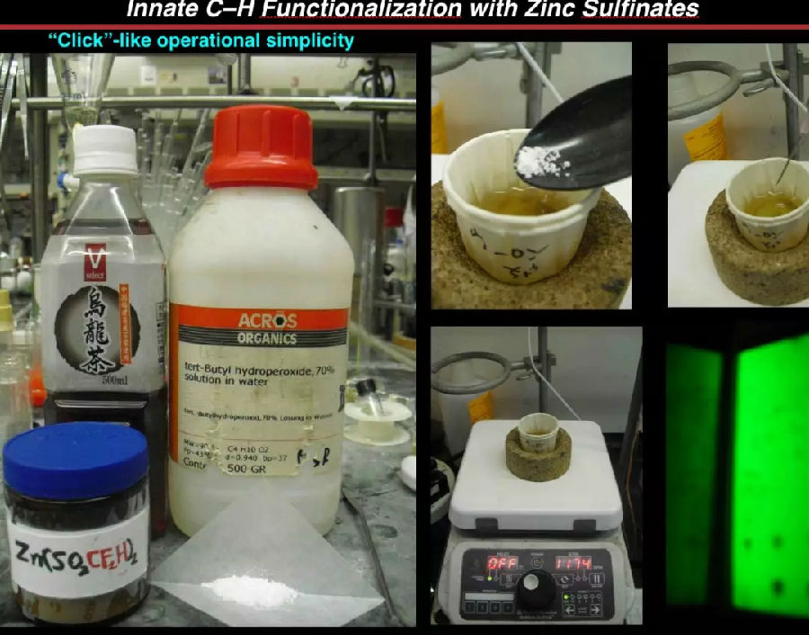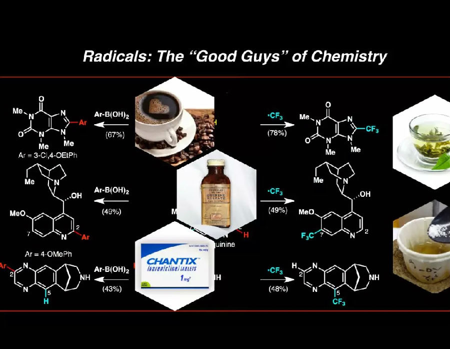 这里列举三个和自由基有关的例子:咖啡因、奎宁和Chantix。咖啡因可能每个人都摄入过,除了儿童;奎宁,存在于汤力水中(苏打水添加奎宁),Chantix是辉瑞公司戒烟药物中的一种化合物。我们发现可以使用自由基来改变这些化合物的结构,在以前认为这是不可能的。比如说,你可以直接取一些咖啡因并将其烷基化或者芳基化,你可以取一些中间体奎宁,并在区域多样性的位置进行芳基化或烷基化。最后,Chantix也可以用相似的方式,使用自由基来分析和编辑有问题的分子。你可以在非常不寻常的环境中做这些反应,因为自由基与极性中间体不同,自由基并不关心像水这样的东西。