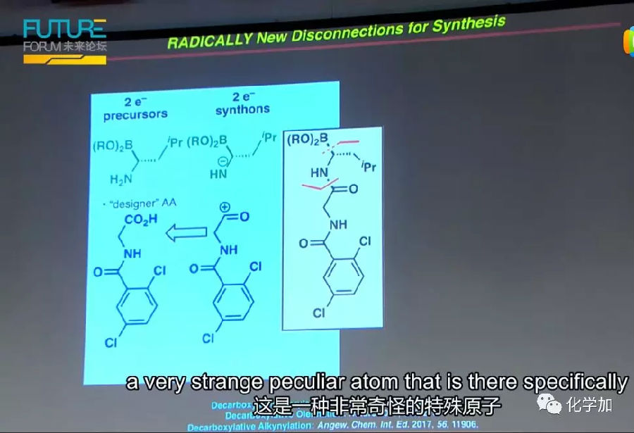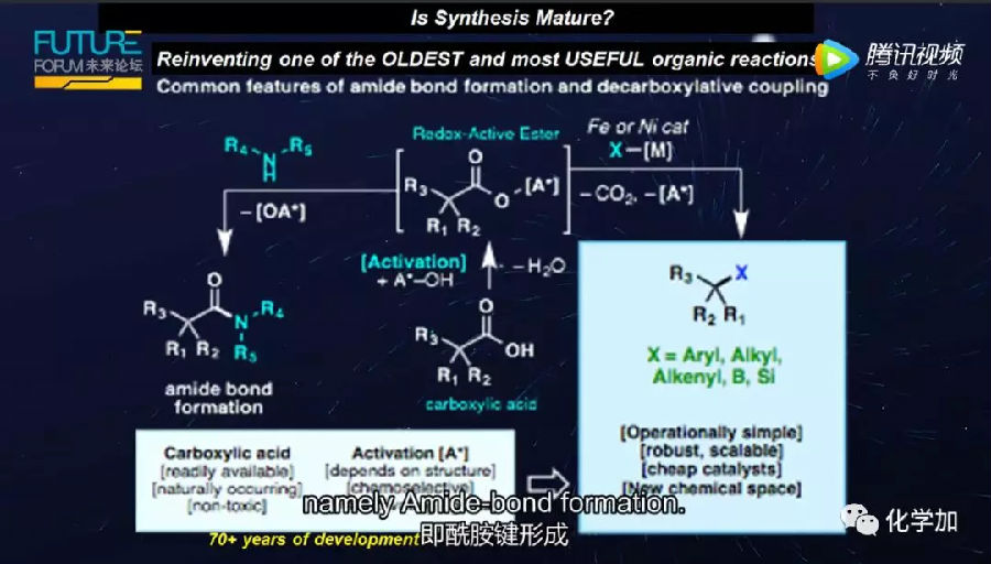 让我用事实来回答这个问题。酰胺键的形成是有机化学中最古老、最无聊也是最常用的反应。70多年来,这个反应每天会被化学家使用无数次。因此,如果合成化学已经成熟,你会认为这里没有什么可被发现了。但我们重新审视了酰胺键形成,并思考是否有可能拦截成为氧化还原活性酯的关键中间体。假如不是通过添加使其脱水的亲核试剂,而是直接把一个电子加到同样的中间体,致使这个化合物变成之前从未见过的完整多样化合物的前兆。