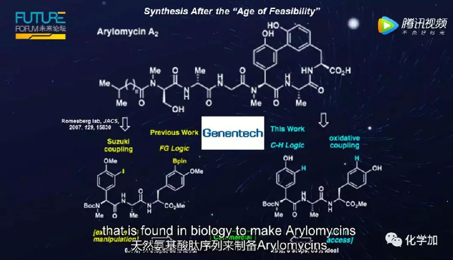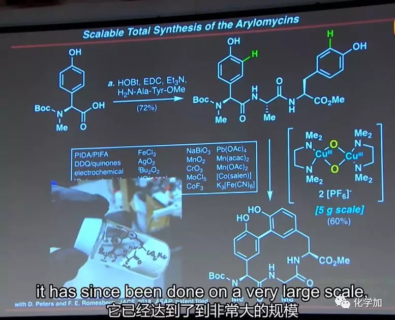 因此,我们需要发明一种新的铜基氧化剂,以实现关键的碳-碳键的合成。这样做的效果是,我们能够将这个反应规模进行放大,它已经达到了到非常大的规模,Genentech申请了专利,制作成本降低了200多倍,并使Genentech能够基于我们的Arylomycins从临床候选药物进入临床。因此,现在大家可以使用这种新发明的氧化系统以公斤级规模进行这些反应。