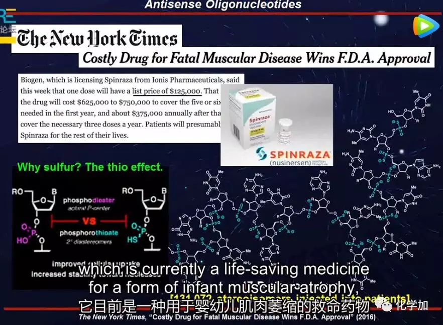 他们将这种称为反义寡核苷酸的化合物注入其脑脊髓液。半衰期是200天,它基本上消除了伴随这种疾病的各种病症。这种有趣的寡核苷酸的惊人之处在于它目前作为一种一万三千种异构体的混合物销售。他们的顾客,即患者,每年必须支付一百万美元才能服用这种混合的化合物。你可能想知道这怎么可能?答案是,核心有机化学家一直没有解决这个问题。为什么这种化合物有这么多的非对映异构体?答案来自于观察结构,你会注意到这不是磷酸二酯骨架,是由磷酸二酯结合在一起。相反,这些都是由磷酸盐、硫代磷酸盐共同连结在一起的。这的确是30年前的化学发明。