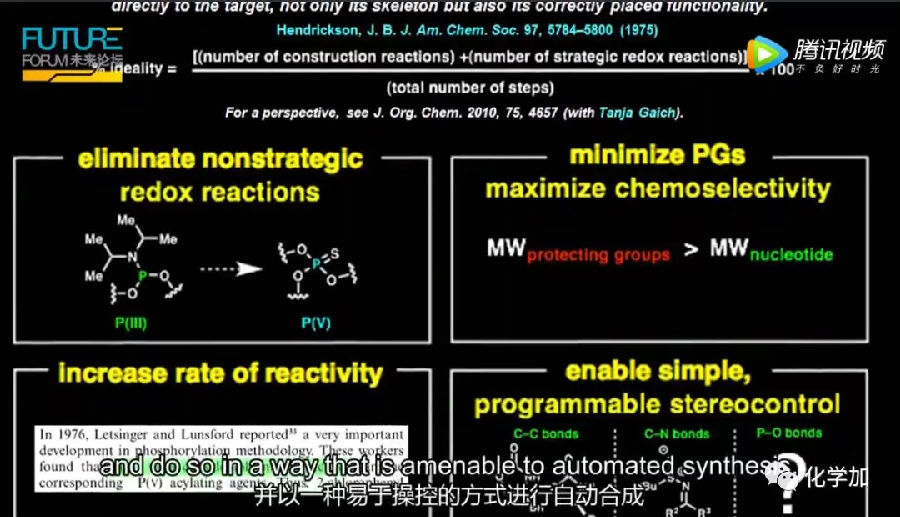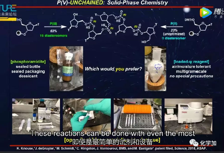 回到寡核苷酸合成的例子上。当然了,如果你能够彻底改变寡核苷酸合成,那将极大地实现量产。事实上你可以。使用五价磷试剂,你可以在实验台上使用简单的试剂进行这些反应。 看看HPLC,是只有一种化合物的纯度,而不是杂乱的混合物。即使是最简单的试剂和设备,这些反应也可以完成。事实上,你现在可以使用标准的肽合成仪制作寡核苷酸,这种合成仪量大,价优,或者用寡核苷酸合成仪。我们相信这将改变人们在工业中制造寡核苷酸的方式。 它清楚地提醒人们,有机化学能够改变它接触到的任何领域。