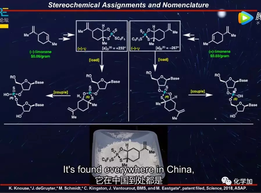 我们选择了一种非常简单的试剂,它实际上来源于食物。柠檬烯。每个人都吃过柠檬烯,只要你吃过早餐、午餐或水果。它在中国到处都是,你可以几块钱就可以买上一克。是一种基于五价磷构建体的极其简单的试剂,现在可以让你可靠地加载核苷并将它们偶联,形成具有非常重要的硫代磷酸酯链接的寡核苷酸,硫代磷酸酯连接具有完全可控、高产率和保真度。使用的规则非常简单并且可以预测,右手或左手形式的对映体现已商业化,如你所见,百时美施贵宝在不断使用这种试剂来制造二核苷酸,即使是大规模也没有任何问题。