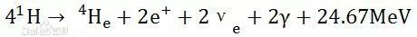 太阳中所蕴含的元素包括90%的氢,还有氦和少量较重的元素。在太阳的核心(其体积不足太阳的2%,质量却超过了太阳的一半)处,氢原子核(也就是质子)在1500万度的高温下和极高的压力下,快速移动,相互猛烈撞击、融合,形成了氦,太阳便是从此过程中获取的能量,发出光和热的,就是如下这个方程式——