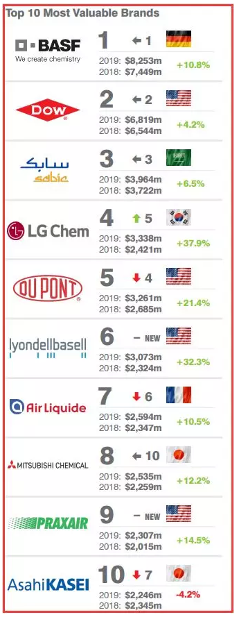 2019年的新进入者是美国的利安德巴塞尔(LyondellBasell),品牌价值上升32%,达到31亿美元,排名第六。