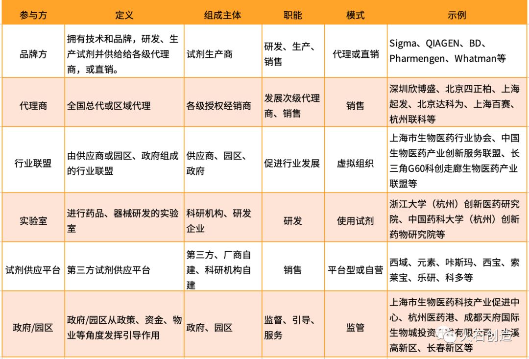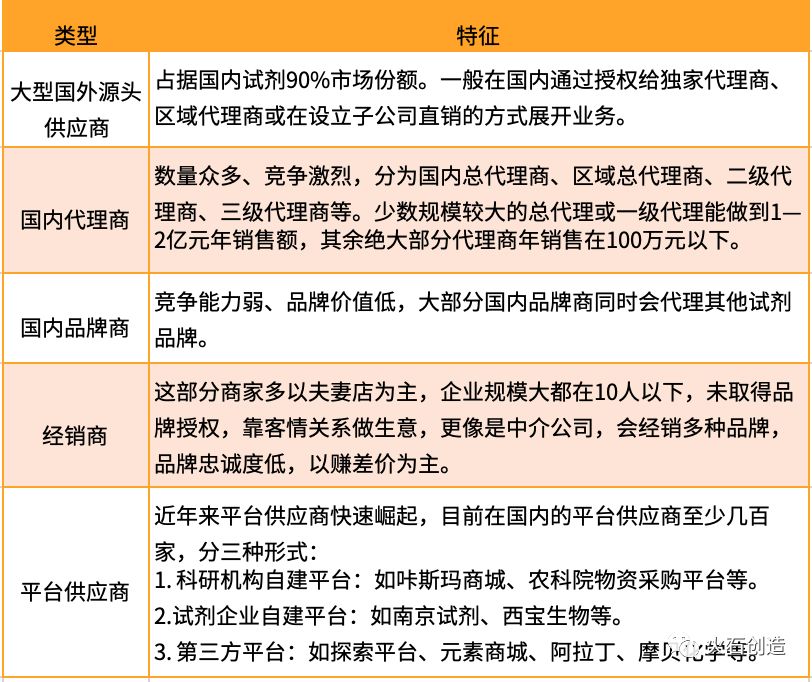 我国实验试剂供应商主要有5种,分别是大型国外源头供应商,如Sigma、Life、BD、Whatman等;国内代理商,主要代理或分销国外试剂为主;国内品牌商,研发并销售自有品牌试剂,绝大部分国内试剂品牌商也会代理其他品牌试剂;经销商,以中小企业为主,未取得品牌授权,会经销多个品牌的试剂,以客情关系为主;平台供应商,以第三方、科研机构或品牌自建在线供应链平台为主。表3