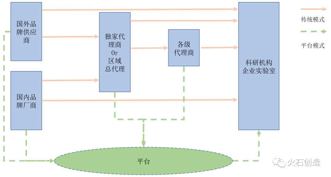 一直以来,我国实验试剂都是传统的代理经销模式,即品牌商(厂家)通过独家代理和各级分销商形式对产品进行销售,同时厂家也会采取直销的方式(图中实线所示)。随着互联网尤其是产业互联网的出现,为避免行业乱象(极少数经销商参与科研经费套现的腐败行为)和规范采购管理,科研机构率先建立自己的采购管理平台,国内的科研试剂平台如雨后春笋般出现。实验试剂市场化行为越来越快,部分行业资深人士看到了这里面的商机,开始从第三方角度创建平台。部分大品牌上也开始自建自己的试剂商城,能以较少的成本面向更多的消费者,并且对自己的经销体系和产品进行数字化(图中虚线所示)。