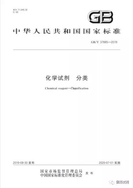近日,国家市场监督管理总局(国家标准化管理委员会)发布了2019年第10号中国国家标准公告,GB/T 37885-2019《化学试剂 分类》国家标准正式发布,将于2020年7月1日起实施。