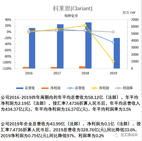 根据科莱恩公布的2019年财报显示,公司2019年营业收入同比下降33.6%,与2018年基本持平;净利润大幅下滑至3800万瑞士法郎,同比下降97%。公司目前大力打包出售业务,以谋求更好的发展,2020年真是替公司捏把汗。