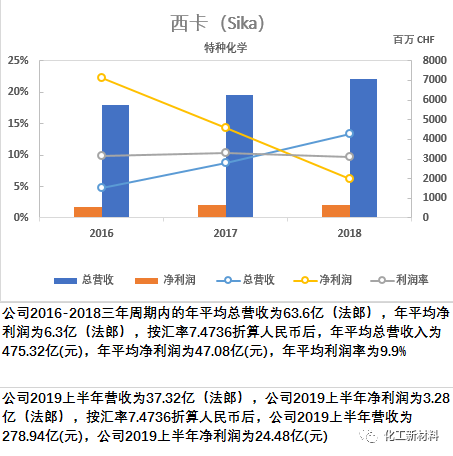 西卡公司在2016-2018年营收基本保持稳定增长,利润增幅虽有所下滑但整体还保持在5%以上。从公司2019年上半年财报来看,公司经营状况还比较稳定。