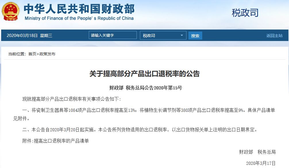3月17日,财政部发布了“关于提高部分产品出口退税率的公告”。本公告自2020年3月20日起实施。本公告所列货物适用的出口退税率,以出口货物报关单上注明的出口日期界定。