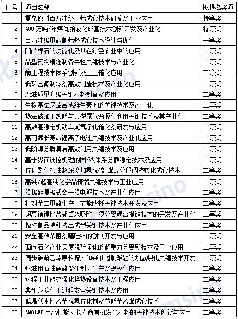 以下是2020年国家科技进步奖化工组28个项目名单(排名不分先后):